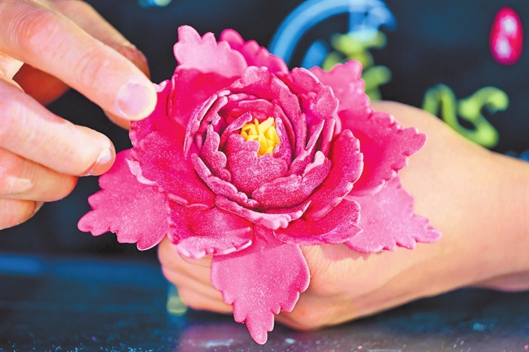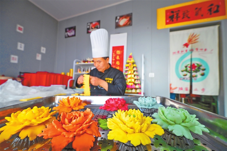 第42届中国洛阳牡丹文化节临近,在洛阳市某面艺工作室,面点师制作牡丹花馍伴手礼,来洛游客既能赏花,又能尝“花”,让牡丹花在舌尖绽放(3月24日摄)。李卫超 摄